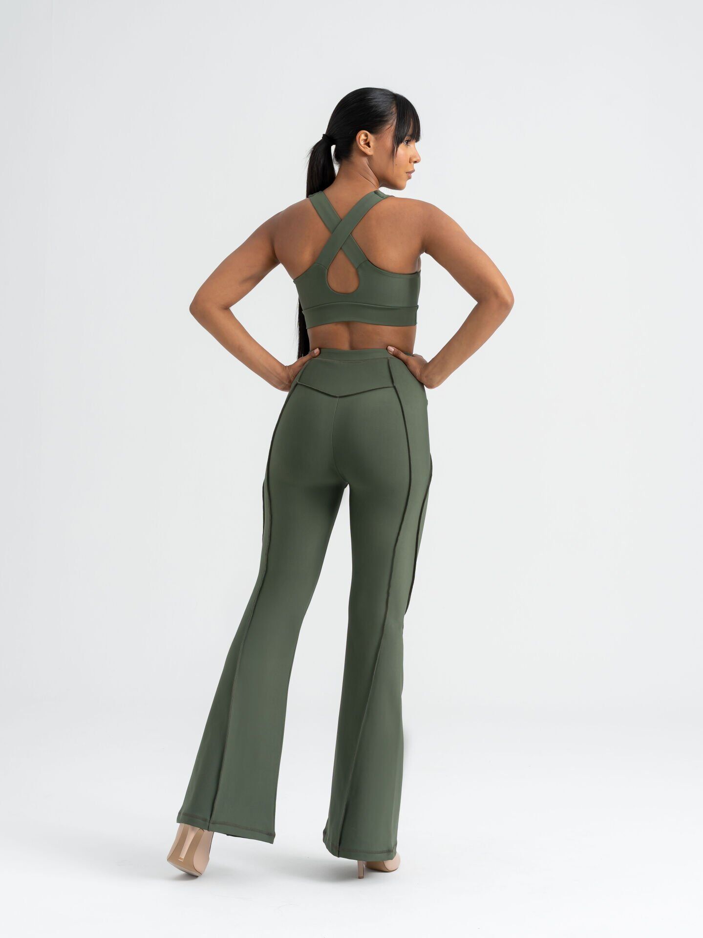 The V-shaped front seam visually slims the waist and lifts the hips, while the flared leg cut elongates the legs, offering a sleek and fluid silhouette.