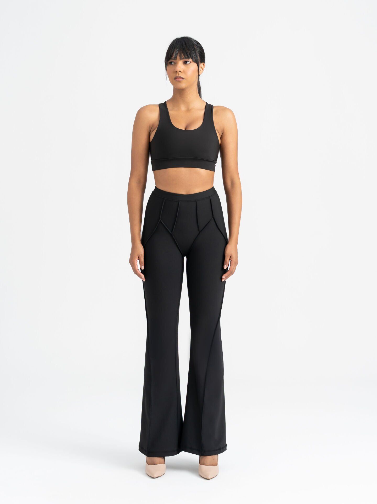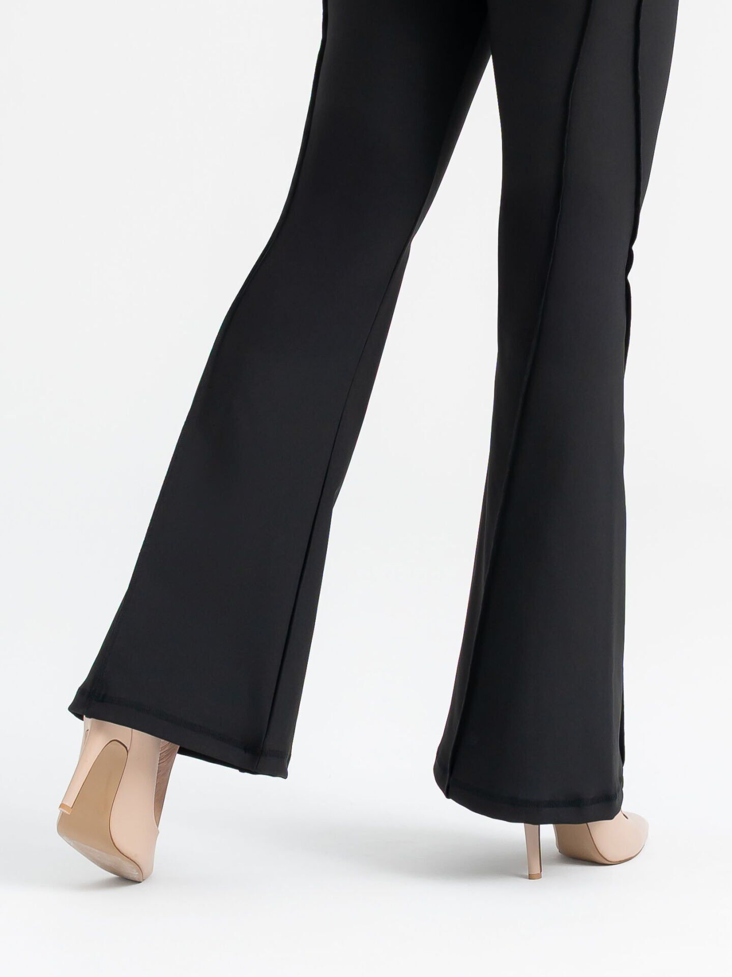 The V-shaped front seam visually slims the waist and lifts the hips, while the flared leg cut elongates the legs for a sophisticated, flowing appearance.