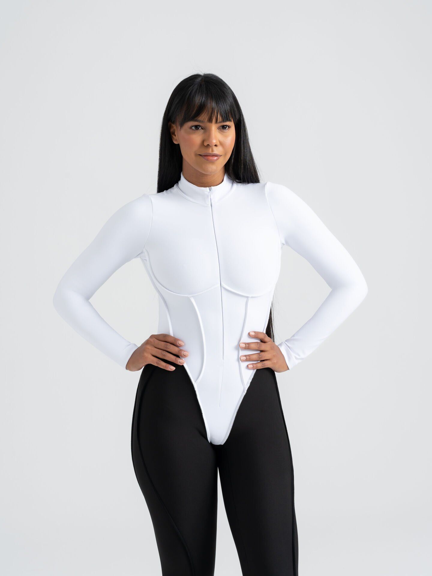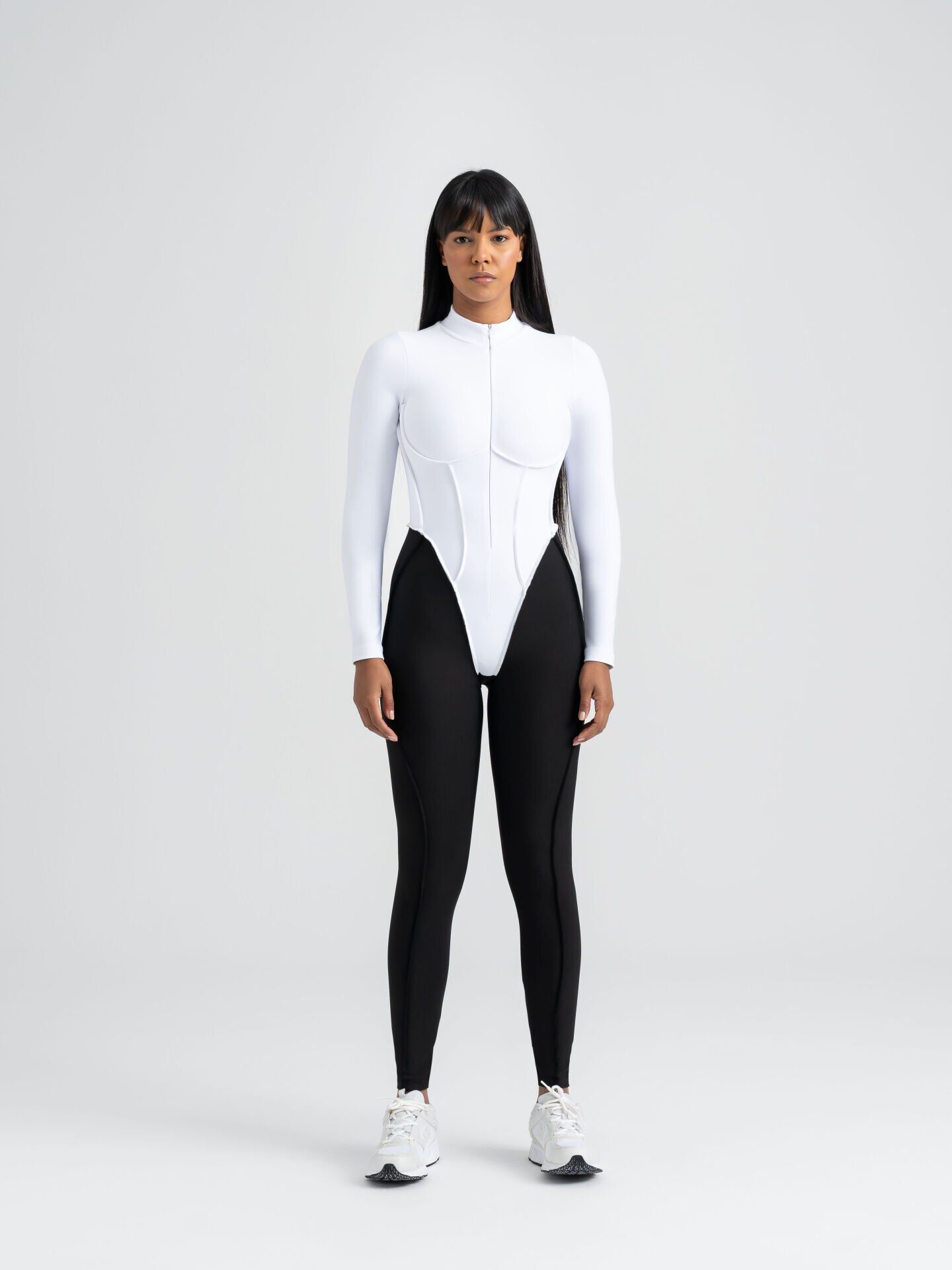 This special design brings together the strong contrast of a white top and a black bottom, hugging the body firmly and defining the curves.