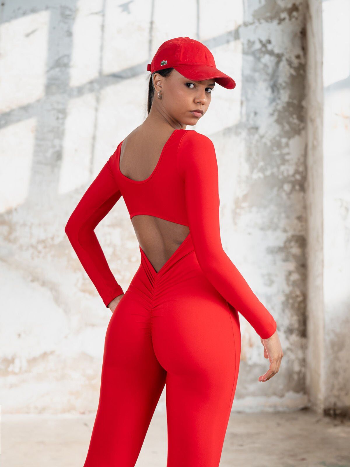 2503 Sleeve Scrunch Butt Jumpsuit Red Color